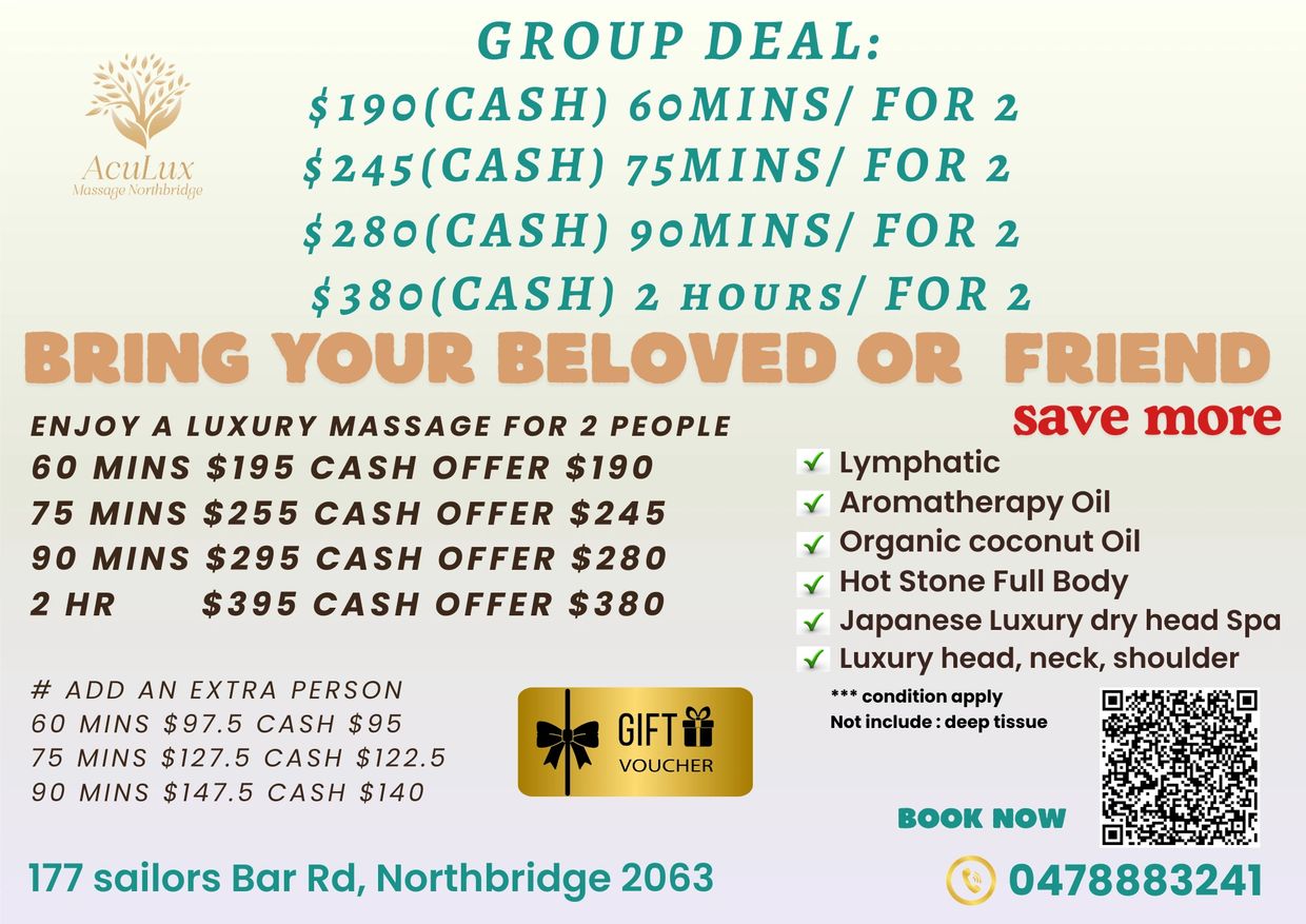 At AcuLux Massage Northbridge, our mission is to support holistic healing and long-term wellness through evidence-based massage therapy and acupuncture. We provide personalized, therapeutic treatments that address the root causes of tension, pain, and imbalance—helping our clients restore harmony in body, calm in mind, and energy in spirit. In a nurturing and professional environment, we are committed to guiding each person toward deeper relaxation, improved health, and a renewed sense of vitality.